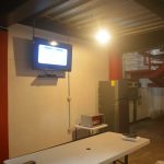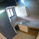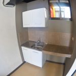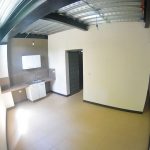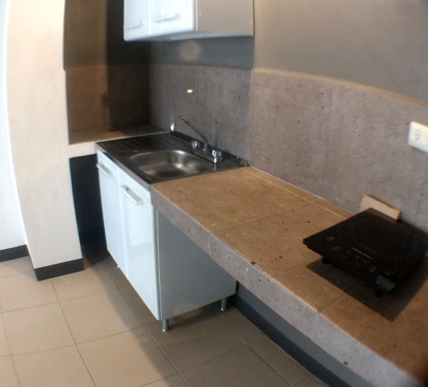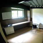 Baño completo y barra con estufa de convección, tarja y alacena.