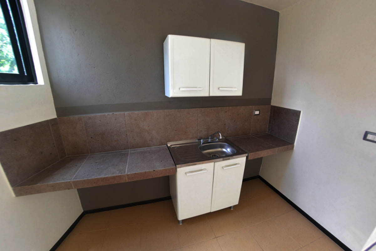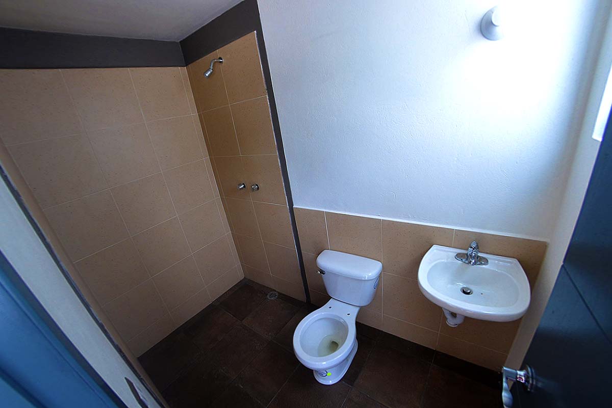 Baño completo y barra con tarja y alacena.